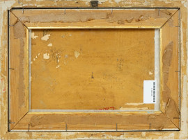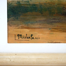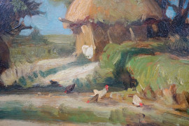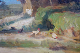 Covone con galline, olio su cartone, cm 30x42, firmato, entro cornice.