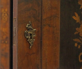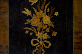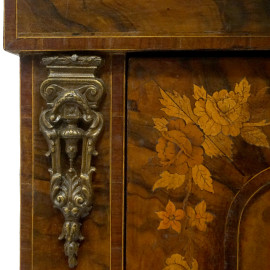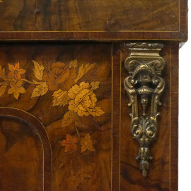 Credenza impiallacciata in vari legni pregiati, Francia, metà XX secolo, fronte ad uno sportello intarsiato a bouquet di fiori, piede a mensola, finiture in bronzo dorato, cm h 117,5x83x41,(difetti)