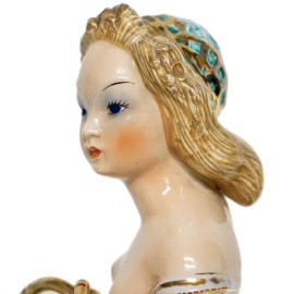 Dama con cestino, scultura in porcellana policroma e lumeggiature dorate, cm h 32,5, firmata G.Girardi sotto la base.