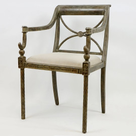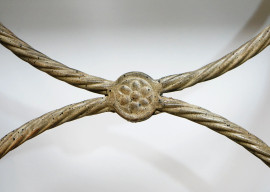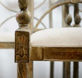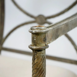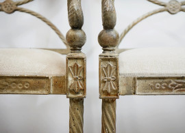 Dieci sedie in ferro battuto ed argentato, con seduta imbottita e rivestita in tessuto beige, XX secolo, cm h 90, (difetti, mancanti due applicazioni sui braccioli).