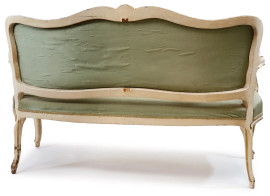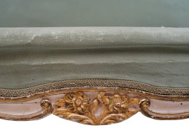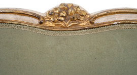 Divano in legno laccato e dorato, schienale e seduta imbottiti e rivestiti in tappezzeria verde, braccioli e gambe mosse, cm h 96x144x58, (difetti)