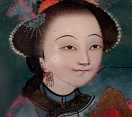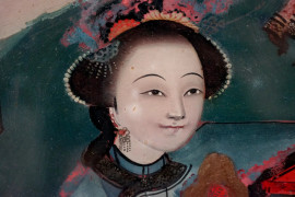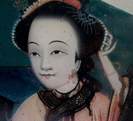 Due figure orientali in interno, olio su vetro, cm 21x33 caduno, Cina, XX secolo, entro un'unica cornice, ingombro totale cm 57x41