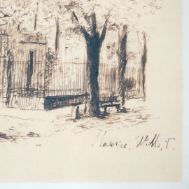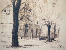 Esterno di chiesa, china su carta, cm 14,5x16,5, firmato, entro cornice.