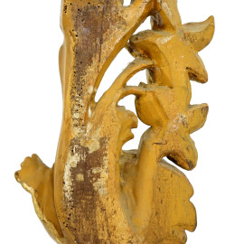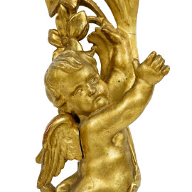 Fregio in legno scolpito e dorato ornato da putto, fiori e foglie d'acanto, XIX secolo, lunghezza cm 85, (difetti)