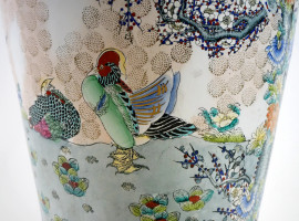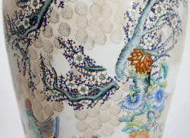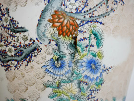 Grande vaso in porcellana policroma, decori di tronchi d'albero e fiori di loto su rami e volatili, Cina, XX secolo, cm h 133