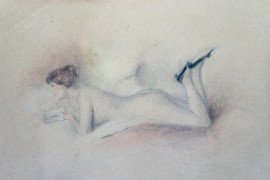 In lettura, tecnica mista su carta, cm 19,5x26, metà XX secolo, entro cornice.