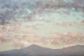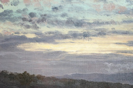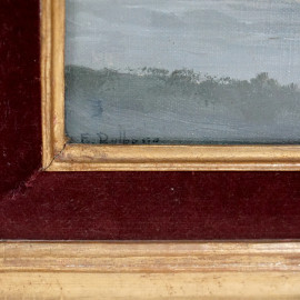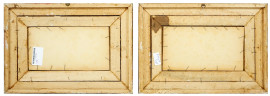 L'alba ed il tramonto, coppia di dipinti ad olio su cartone telato, cm 13,5x25,5, uno firmato Dalbono, entro cornici
