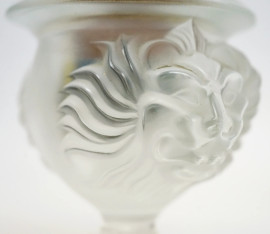 Lalique - France, set da fumatore in cristallo, composto da portasigarette ed accendino, decori a teste leonine, firma incussa sotto la base, alt.max cm 12.