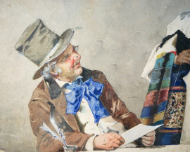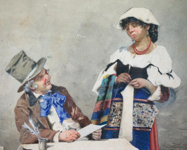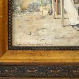 Lo scrivano pubblico con una popolana, acquarello su carta, cm 35x25, firmato Guerrino Guardabassi Roma, entro cornice
