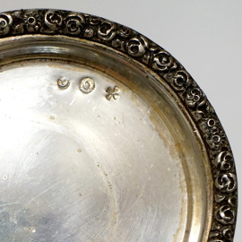 Lotto composto da 3 sotto bottiglie e 12 sotto bicchieri in argento, con profili cesellati a roselline, diam. max cm 14,5, peso gr. 2030