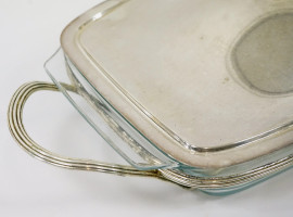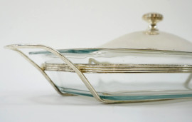 Lotto composto da quattro legumiere in metallo con vaschette in vetro, misure max cm 13x50x21, XX secolo.