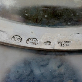 Lotto composto da sei vassoi e sei piattini in argento, manifatture diverse, punzoni Petochi Roma e A.Cesa Alessandria, XX secolo, diam max cm 47x32, peso gr. 6830