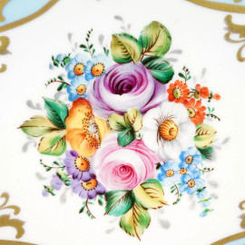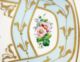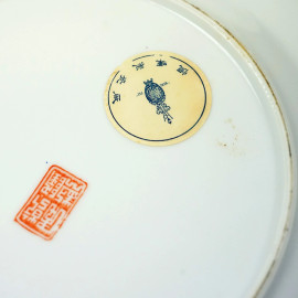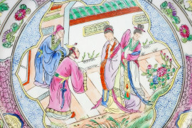 Lotto di due piatti in porcellana policroma con decoro di figure orientali e motivi floreali, lumeggiature dorate, Cina e Limoges, XX secolo, diam. max cm 28,5