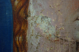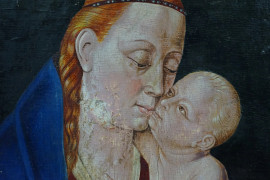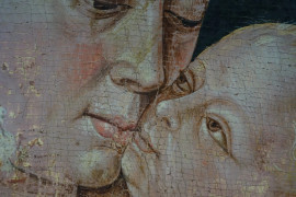 Madonna col Bambino, antico dipinto ad olio su tela applicata su tavola, cm 52.2x38, (difetti e restauri)