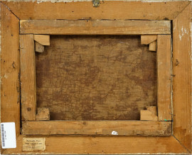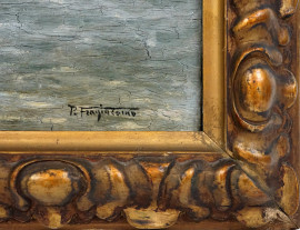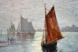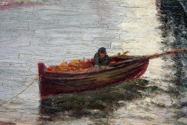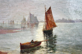 Marina con imbarcazioni, olio su tela, cm 25x33, firmato, entro cornice.