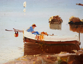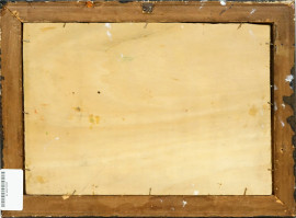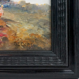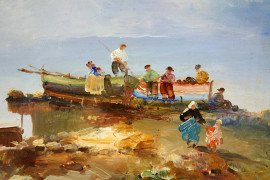 Marina napoletana con figure e pescatori, olio su compensato, cm 24x34, firmato, entro cornice