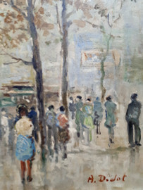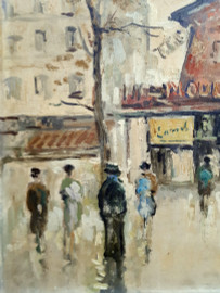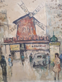 Maurice Utrillo (seguace) Viale parigino con Moulin Rouge, anni 40, dipinto ad olio su tela, cm 50x70, firmato