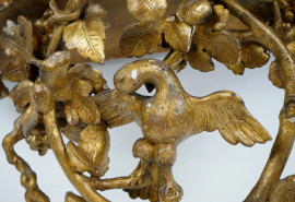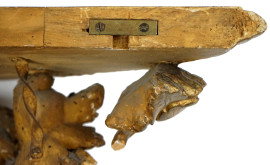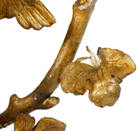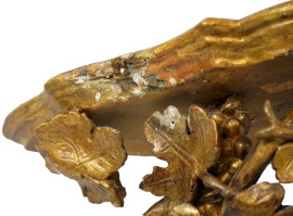 Mensola in legno dorato, XVIII-XIX secolo, piano sagomato sorretto da intaglio a ramages con aquila ed acini d'uva, cm 47x56x25, (difetti e restauri)