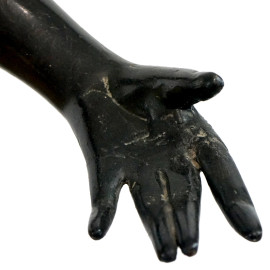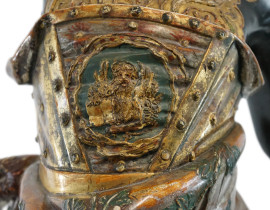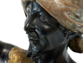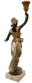 Raffinata scultura raffigurante giovane servitore moro, raffigurato in posa eretta con il braccio destro teso a innalzare la torcia, veste drappeggiata caratterizzata dallo stemma della città di Venezia.