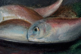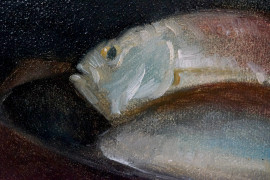 Natura morta con pesci - Aringhe, gamberi ed alici, olio su tela, cm 30x60, firmato, entro cornice.