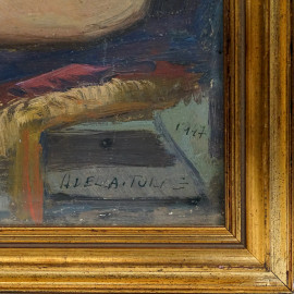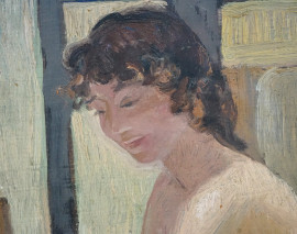 Nudo di donna assorta, olio su tavola, cm 45x31 ca, firmato e datato, entro cornice.