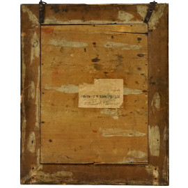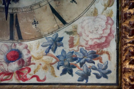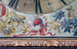 Orologio da parete del XVIII-XIX secolo, quadrante in tela dipinta a numeri romani con decori floreali policromi, cornice in legno ebanizzato con battuta interna dorata e scolpita a foglie di cavolo, ingombro cm 74x60, (meccanismo da revisionare).