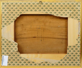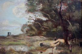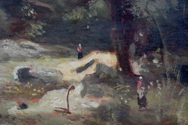 Paesaggio con alberi e figure, olio su tavola, cm 22x29, XX secolo, entro cornice.