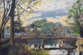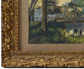 Paesaggio con ponticello, olio su cartone telato, cm 10,5x16, firmato, entro cornice.