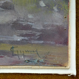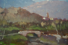 Paesaggio fluviale con ponte, olio su compensato, cm 30x23, firmato Lorenzo Gignous, entro cornice.