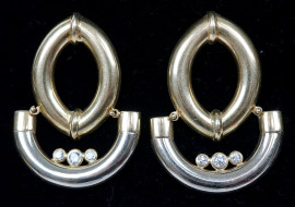 Paio di orecchini anni '80 in oro 18 KT con tris di brillantini, peso gr.10,2, (difetto sul pendente)