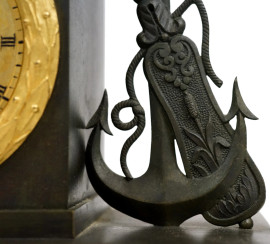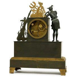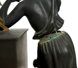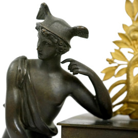 Pendola da tavolo in bronzo brunito e dorato, Francia, XIX secolo, quadrante circolare a numeri romani affiancato da figura di Hermes, cm h 32x24x10, (difetti, meccanismo da revisionare)