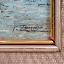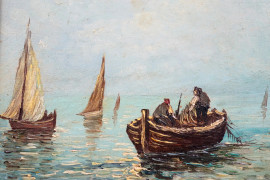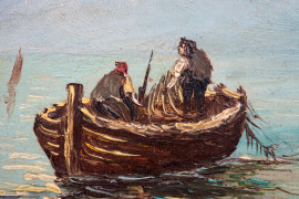 Pescatori, olio su compensato, cm 19x25, firmato, entro cornice.