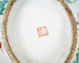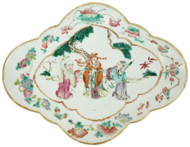 Piccola alzatina di linea sagomata in porcellana policroma, riserva centrale raffigurante anziani saggi, cm 5x28x22, Giappone, XX secolo.