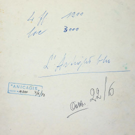 L'artiglio blu, tempera su cartoncino, cm 50x35, firmato Piovano|Studio Paradiso, recante iscrizioni, timbro "Anicagis" e data a tergo, (lievi difetti)