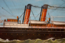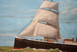 Piroscafo, tempera su carta, cm 60x90, XX secolo, entro cornice.