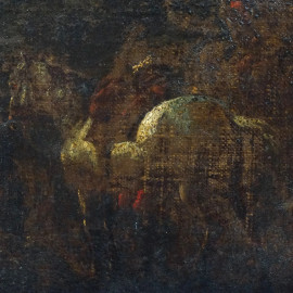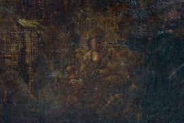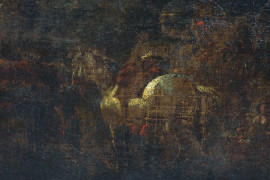 Pittore della fine XVIII secolo, Paesaggio con cavalli e figure in sosta, olio su tela applicata su tavola, cm 30,5x28, (difetti).
