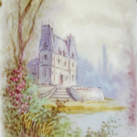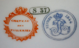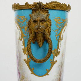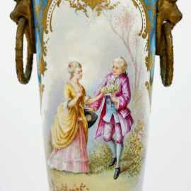 Potiche in porcellana policroma, Sevres, Château des Tuileries, XIX secolo, a fondo celeste con decorazione policroma raffigurante scena di corteggiamento e paesaggio al retro. Montatura e anse leonine in bronzo dorato, cm h 48.