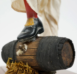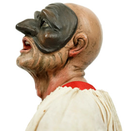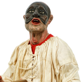 Pulcinella, scultura in terracotta con occhi in vetro e veste in stoffa cucita mano, manifattura napoletana F.lli Capuano, XX secolo, cm h 30, (segni del tempo)