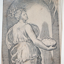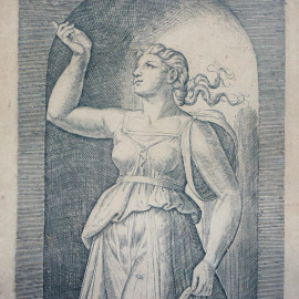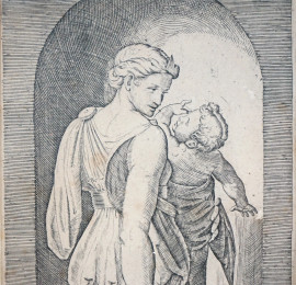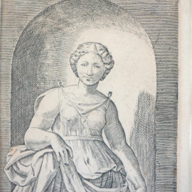 Quattro antiche stampe raffiguranti le Virtù cardinali e teologali, da Marcantonio Raimondi (1480-1534), cm 33x24, entro cornici, (difetti e macchie sulla carta)