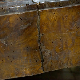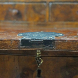 Ribalta lastronata in legni pregiati, XVIII secolo, cm h 101x132x63 circa, (difetti, parti sostituite, mancanze).