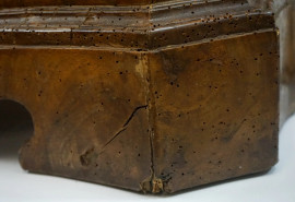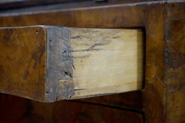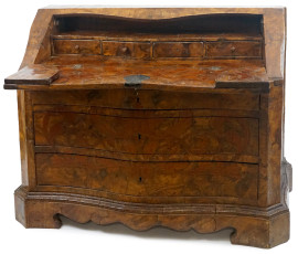 Fronte mosso a tre cassetti ed uno sportello a calatoia celante tre cassettini e grande vuoto all'interno, grembiale sagomato, piedi a mensola.