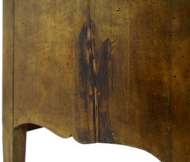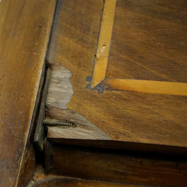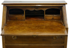 Ribaltina in legno impiallacciato, XX secolo, fronte a due cassetti ed uno sportello a calatoia celante due cassettini e vuoti all'interno, grembiale sottostante di linea sagomata, cm h 104,5x89x41,5, (difetti).
