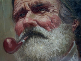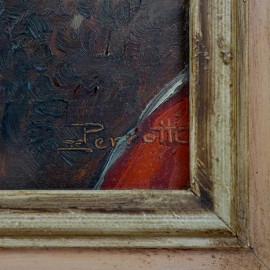 Ritratto di anziano sardo con pipa, olio su compensato, cm 26x26, firmato Perrotti, entro cornice.