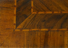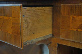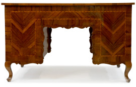 Scrittoio impiallacciato in vari legni pregiati, inizi XX secolo, fronte a tre cassetti e due sportelli, un tiretto, quattro gambe mosse, cm h 80,5x130,5x60,5, (difetti, elementi sostituiti).