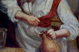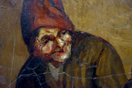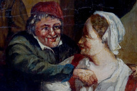 Scuola fiamminga del XIX secolo, Interno di osteria con figure, olio su tavola, cm 38x26,5, (difetti).