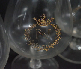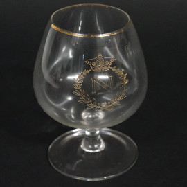 Sei bicchieri napoleonici da Brandy in vetro trasparente con monogramma e profili dorati, XX secolo.