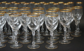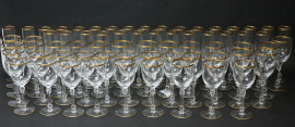 Servizio di calici in vetro con profili dorati, metà XX secolo, composto da: 30 flutes, 18 calici da vino rosso, 18 calici da vino bianco.