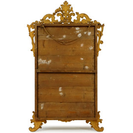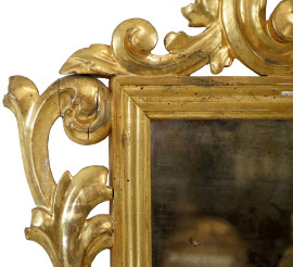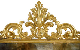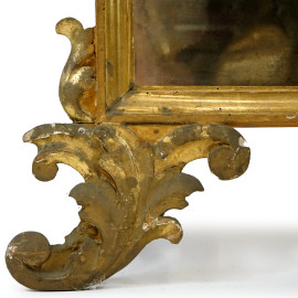 Specchiera in legno intagliato e dorato, XIX secolo, con fregio superiore a volute, foglie d'acanto ritorte e riccioli, piedi anch'essi a riccioli, ingombro cm 175x97, (difetti).