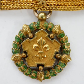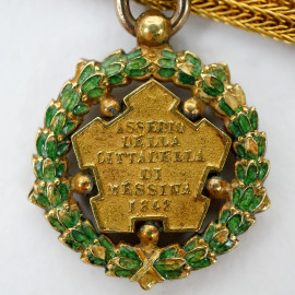 Spilla in oro 18kt con onorificenze dell'Ordine della Corona d'Italia, Assedio della Cittadella di Messina 1848 e Ordine dei Santi Maurizio e Lazzaro, lunghezza cm 6,5, peso gr. 7.6
