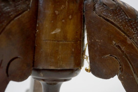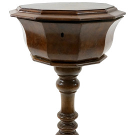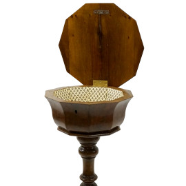 Tavolino da cucito decagonale, XIX secolo, piano apribile sorretto da fusto a balaustro, tre piedi mossi con particolari scolpiti, cm 85x39x39, (difetti)